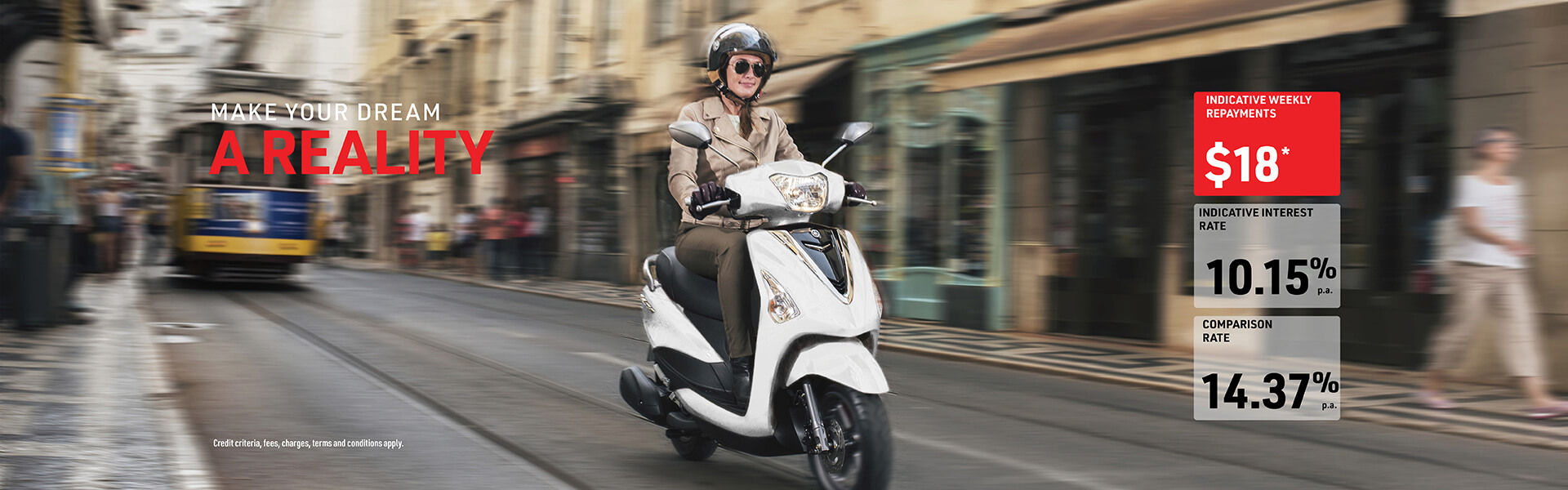 *Repayment amount shown is the weekly equivalent of the monthly instalment of $77.98. It is indicative only and is calculated based on an interest rate of 10.15% p.a. (Comparison Rate 14.37% p.a.), ride away price of $3,599, less a deposit of $266.30 and 60 instalments in arrears with a final balloon payment of $0 and an application fee of $325. an account fee of $5.00 per month and on a Principle and Interest repayment type only. Interest rate used is based on an average individual credit rating and meeting mandatory credit criteria. Repayments and interest rate may vary depending on your individual circumstances, financial position, credit rating, information provided, loan amount and loan term. Offer valid until 31/03/2021. Comparison rate is based on a 3-year secured fixed rate consumer loan of $10,000. WARNING: The Comparison Rate is true only for the example given and may not include all fees and charges. Different terms, fees or other loan amounts might result in a different comparison rate. Credit criteria, fees, charges, terms and conditions apply. Yamaha Motor Finance Aust. Pty Ltd. ABN 29 101 928 670. Australian Credit Licence 394553. This information doesn’t take into account your objectives, financial situation or needs, You should consider whether It is appropriate for you